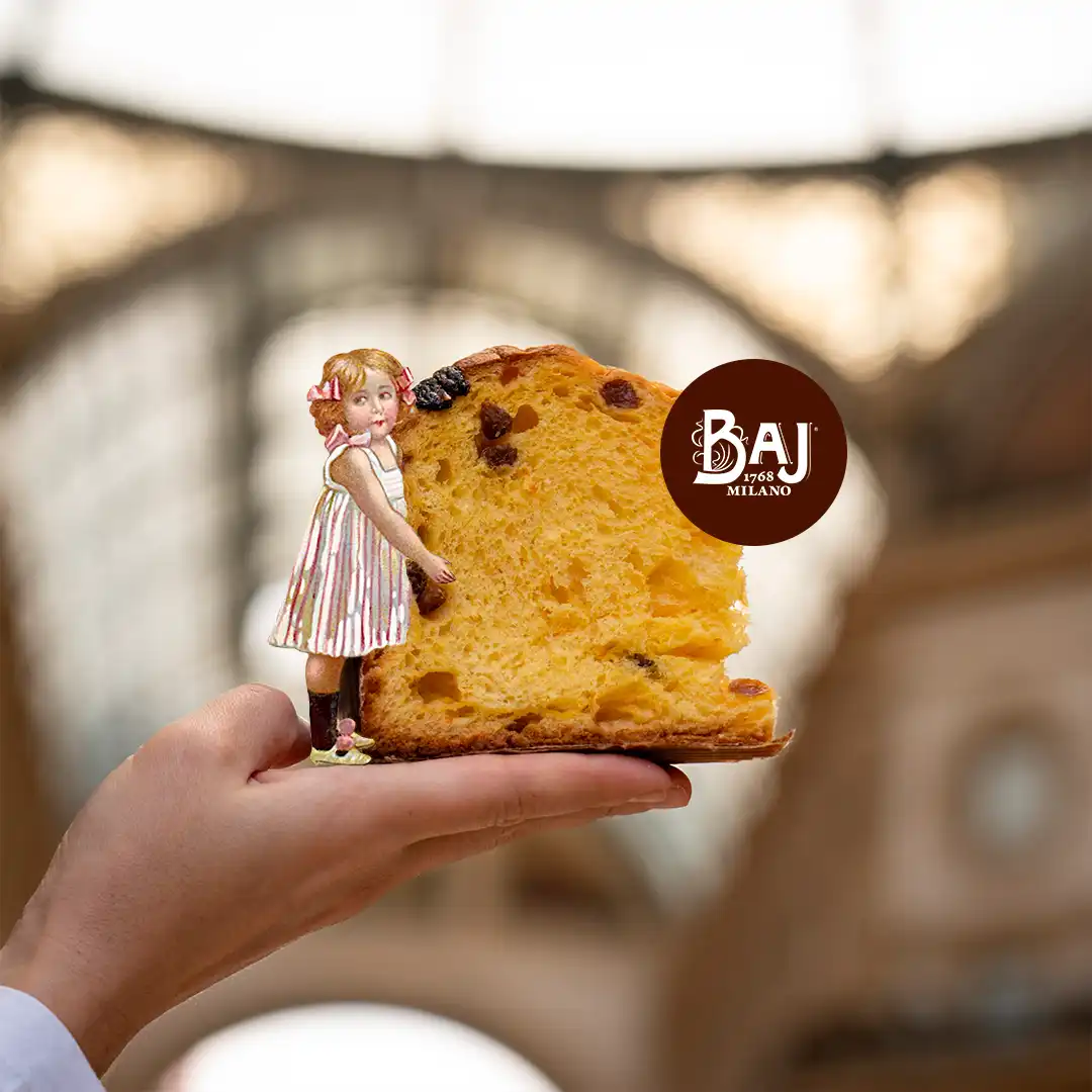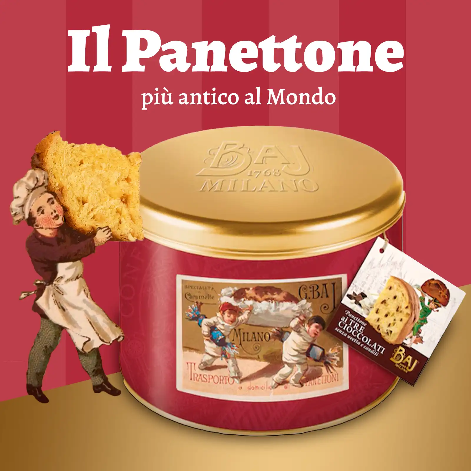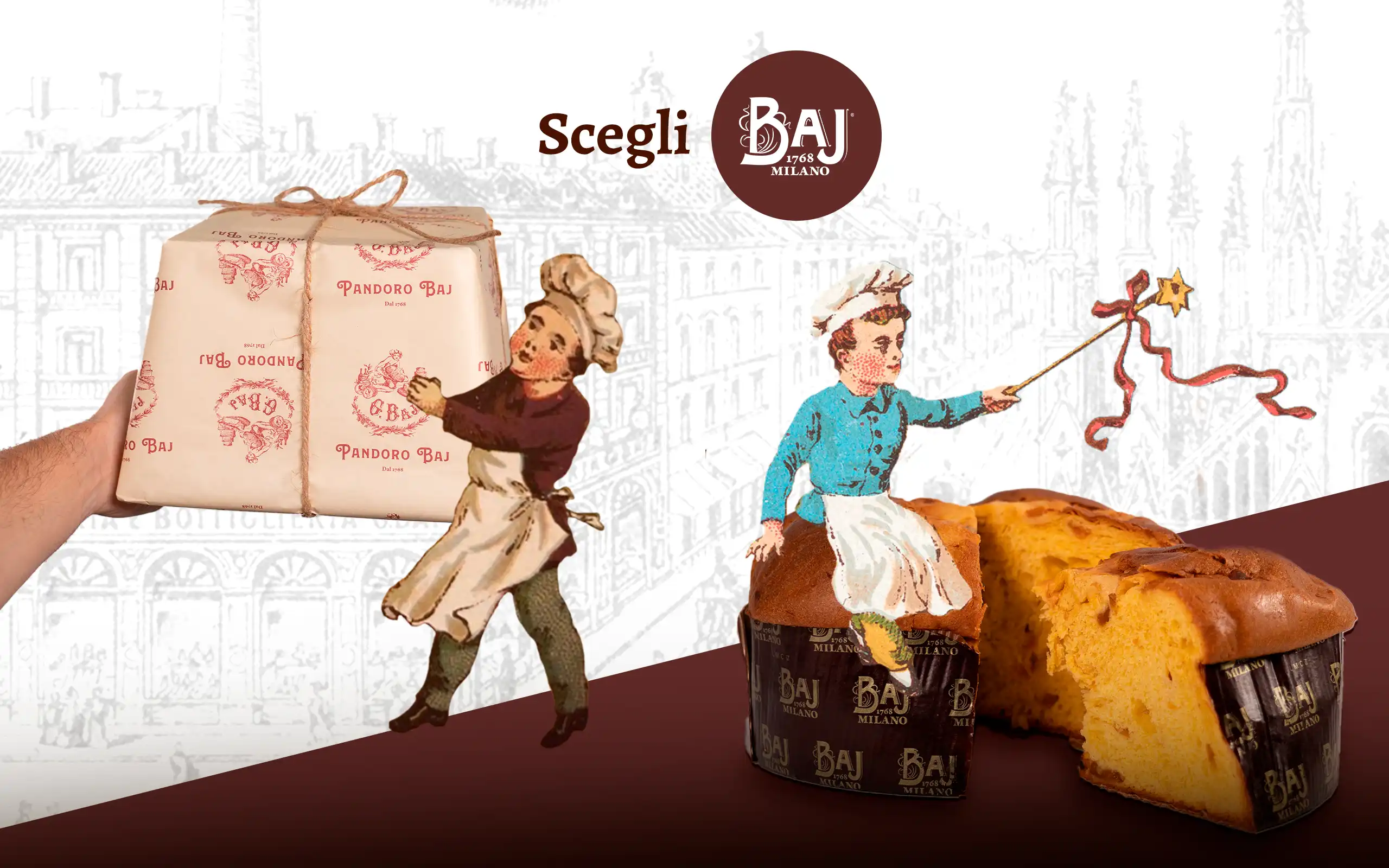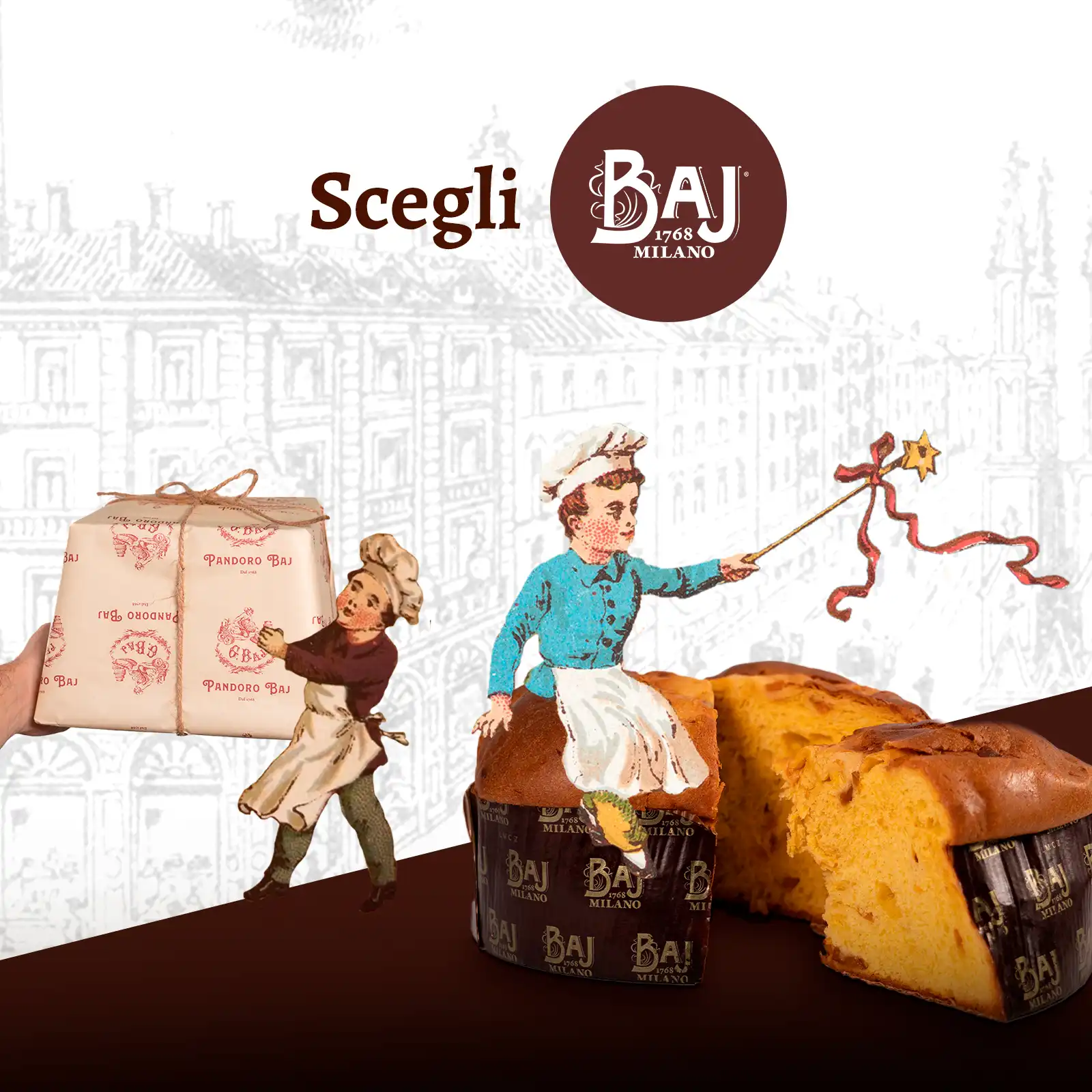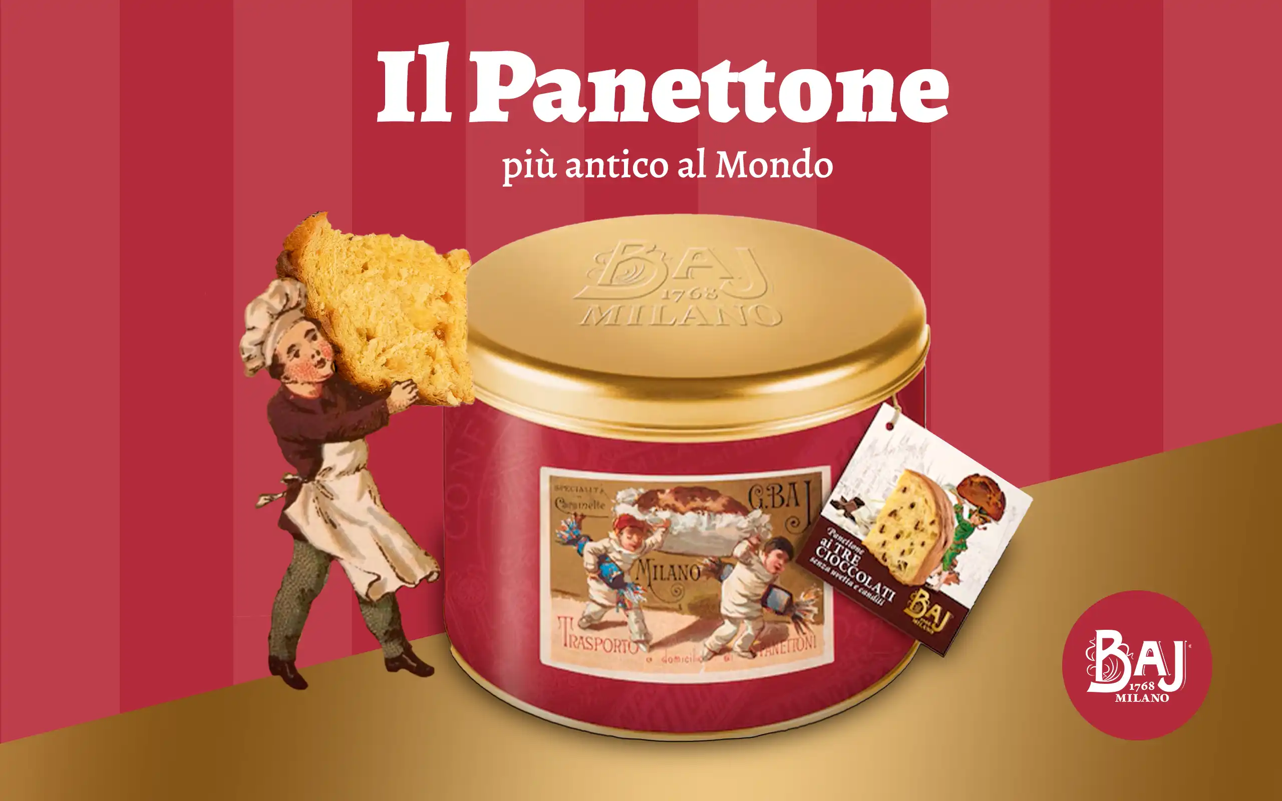 Giuseppe Baj nato nel 1839, lavorò fin da giovanissimo nella pasticceria di famiglia, dove si produceva panettone da tempo immemorabile (documenti risalenti alla fine dell’Ottocento attestano l’inizio dell’attività al 1768). Partecipò ventenne, come volontario garibaldino, nei Cacciatori delle Alpi, alle gloriose campagne per l’Unità d’Italia del 1859 e 1860. Nel 1872 la Confetteria Baj si spostò in Piazza del Duomo, avviando contestualmente un’intensa attività di produzione e commercio di panettoni, cioccolato e altri prodotti dolciari, in uno “stabilimento a forza idraulica ed a vapore”.